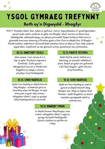 Gweler isod ‘Cylchlythr Beth sy’n Digwydd’ ar gyfer mis Rhagfyr wedi’i atodi; mae’n fis prysur a chyffrous gyda llawer o weithgareddau Nadoligaidd wedi’u cynllunio! Peidiwch ag anghofio bod y calendr ar ein gwefan ysgol www.ysgolgymraegtrefynwy.cymru hefyd yn cynnwys manylion am ein digwyddiadau a’n gweithgareddau. Cofiwch fod dydd Gwener, 5ed Rhagfyr yn ddiwrnod hyfforddi staff ac ni fydd yr ysgol ar agor i ddisgyblion. Fel y soniwyd yn y digwyddiadur, bydd rhagor o fanylion yn dilyn yn fuan ar gyfer rhai o’r gweithgareddau; fodd bynnag, peidiwch ag oedi i gysylltu os oes gennych unrhyw gwestiynau neu ymholiadau.